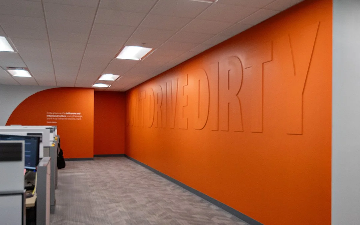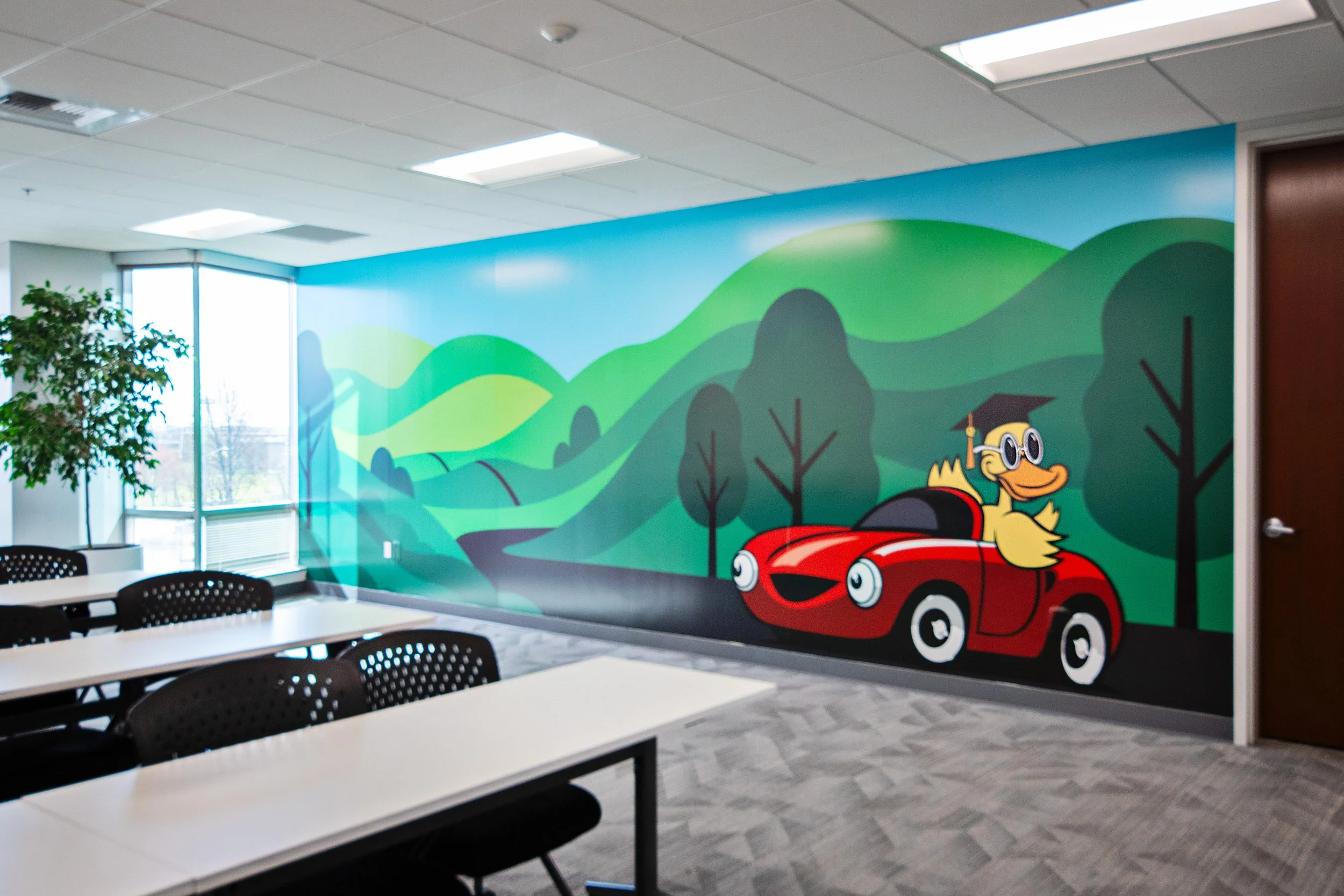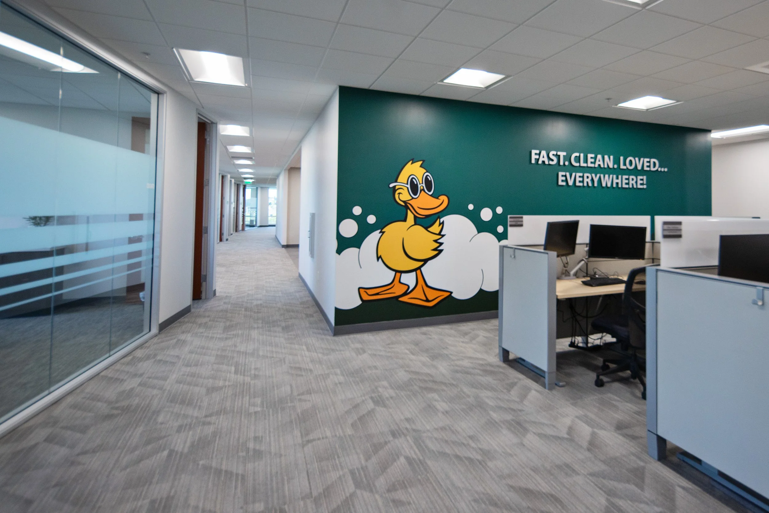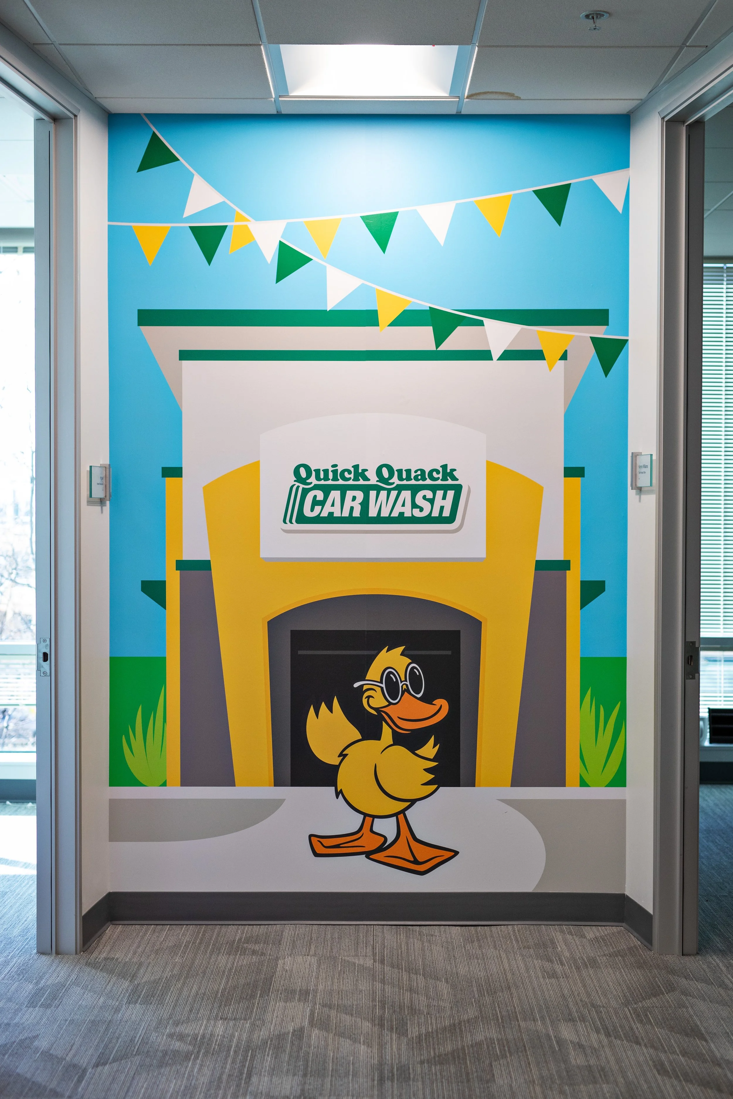 A vibrant environmental branding project for Quick Quack Car Wash's headquarters, designed to make a bold first impression while capturing the brand’s playful energy and spirited culture. The space features custom murals, dimensional installations, branded pattern design, and photography — all working together to bring the company’s personality to life through immersive, on-brand visual storytelling.