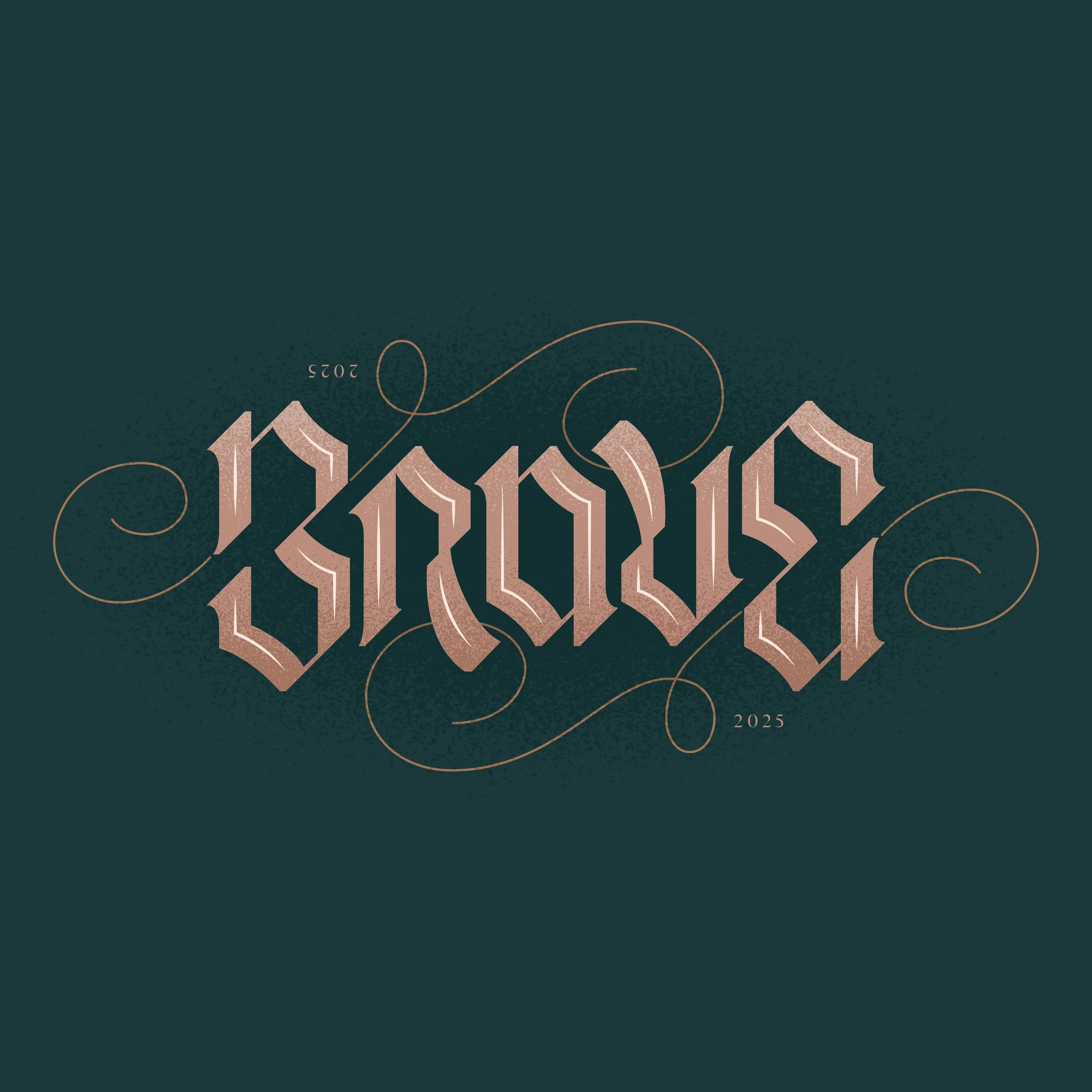 Created as a personal typographic study, this piece showcases a custom ambigram where the word "Brave" reads the same upside-down. The design combines blackletter-inspired forms with contemporary detailing and ornamental swashes to add visual motion. Each letterform was drawn by hand and refined digitally, with vectorization and textured shading for a dimensional, modern finish.