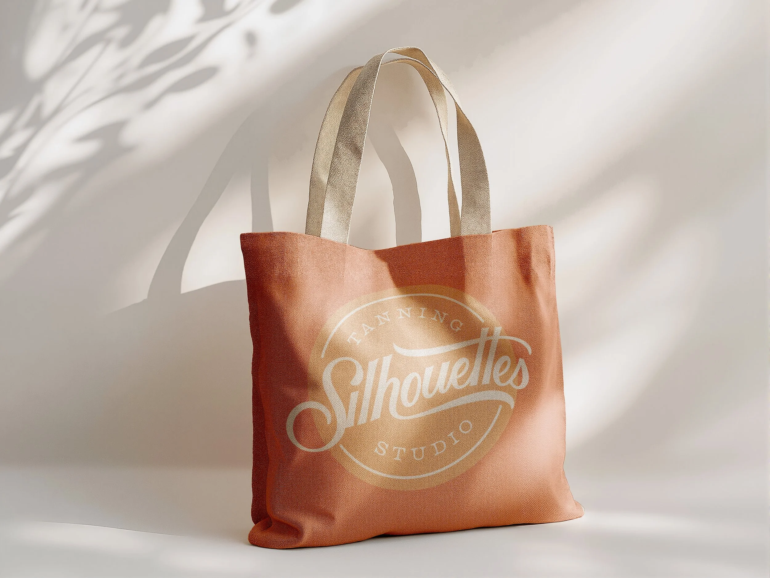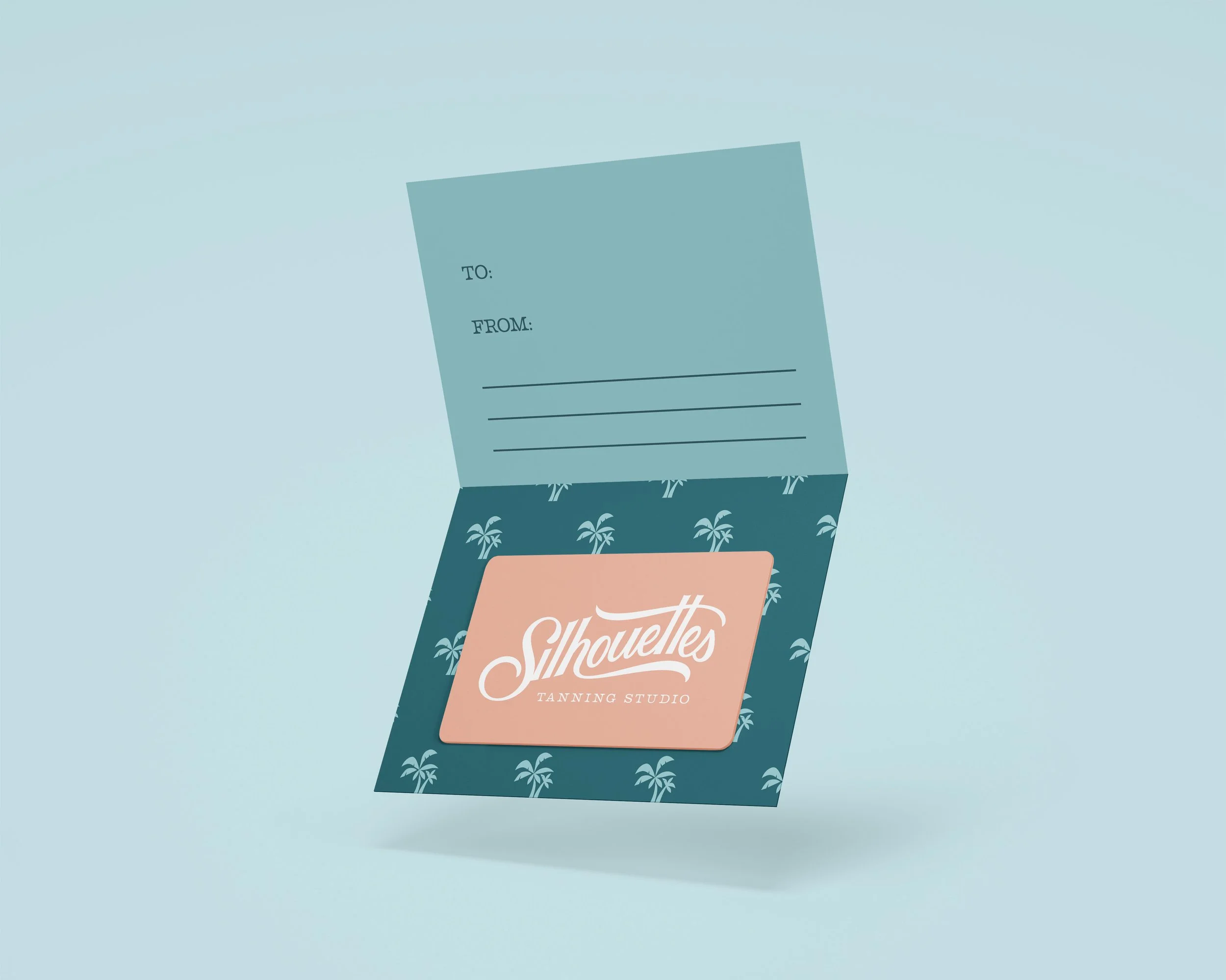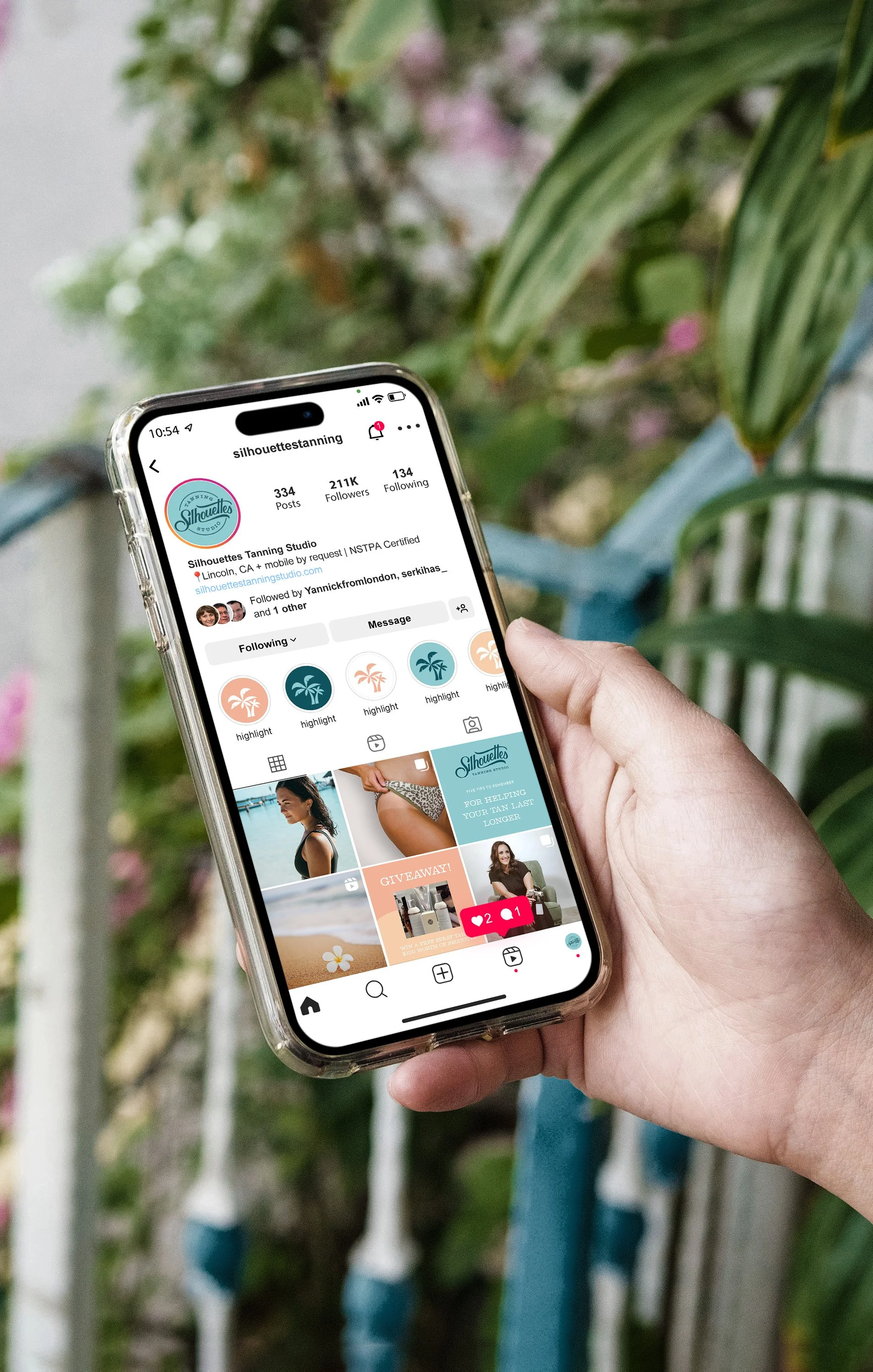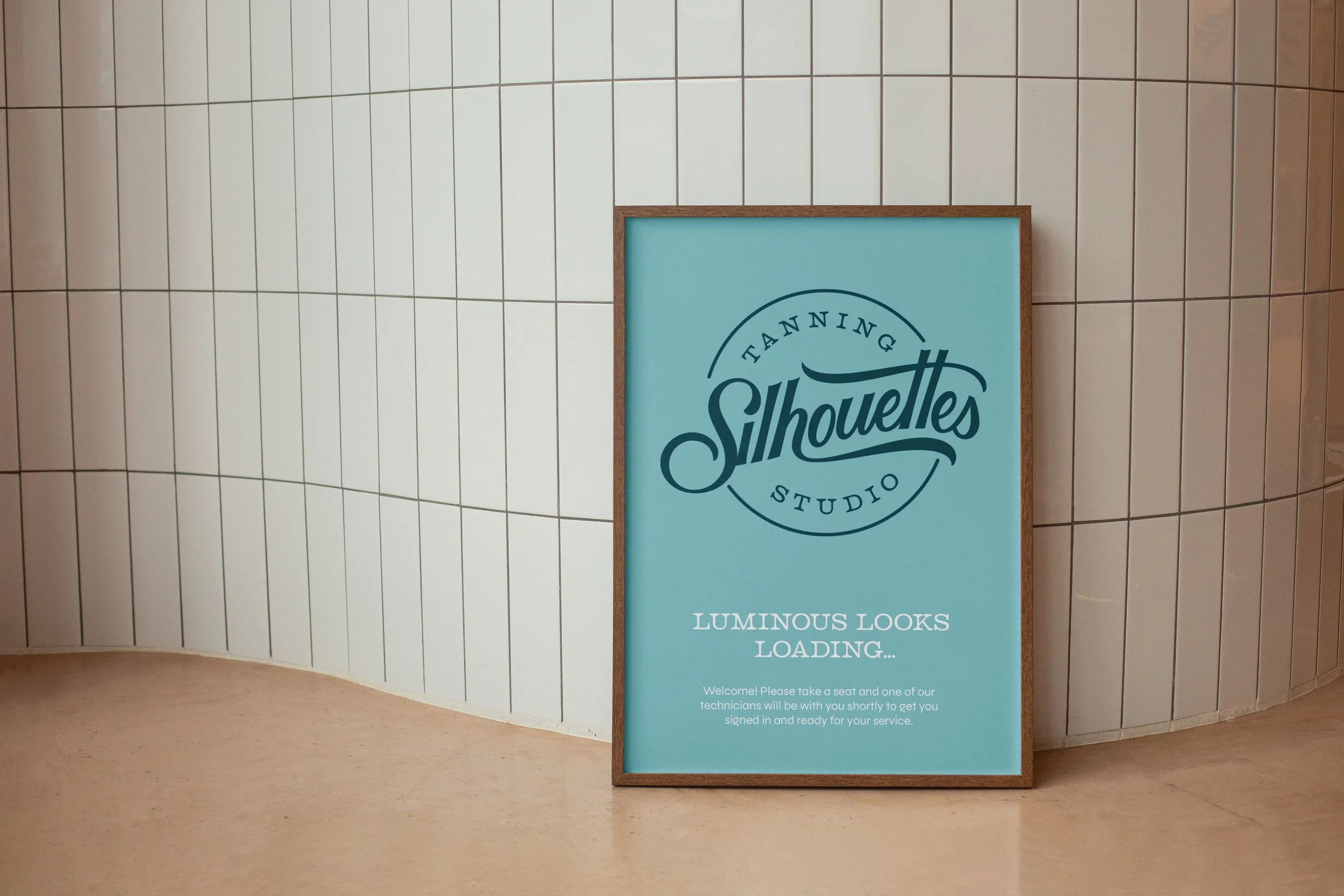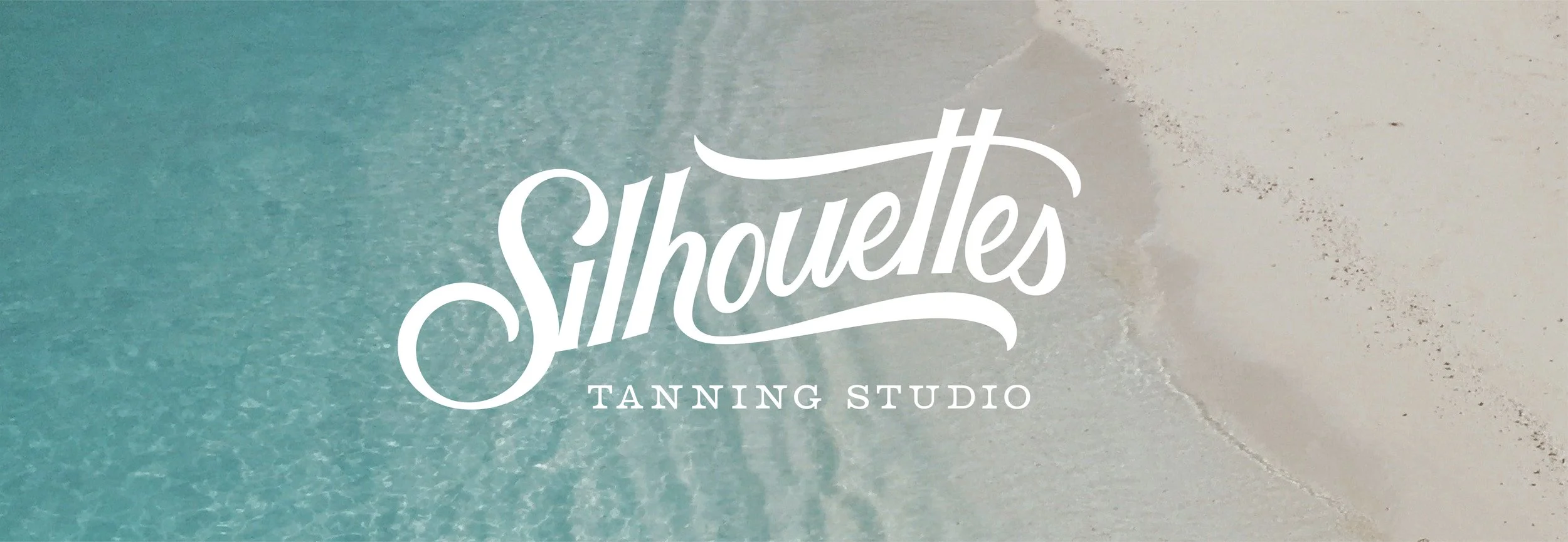 Brand identity for Silhouettes Tanning Studio featuring a custom hand-lettered logo, a bold and sunny color palette, illustrated logo mark, and tropical-inspired pattern design for a cohesive, beach-ready look.