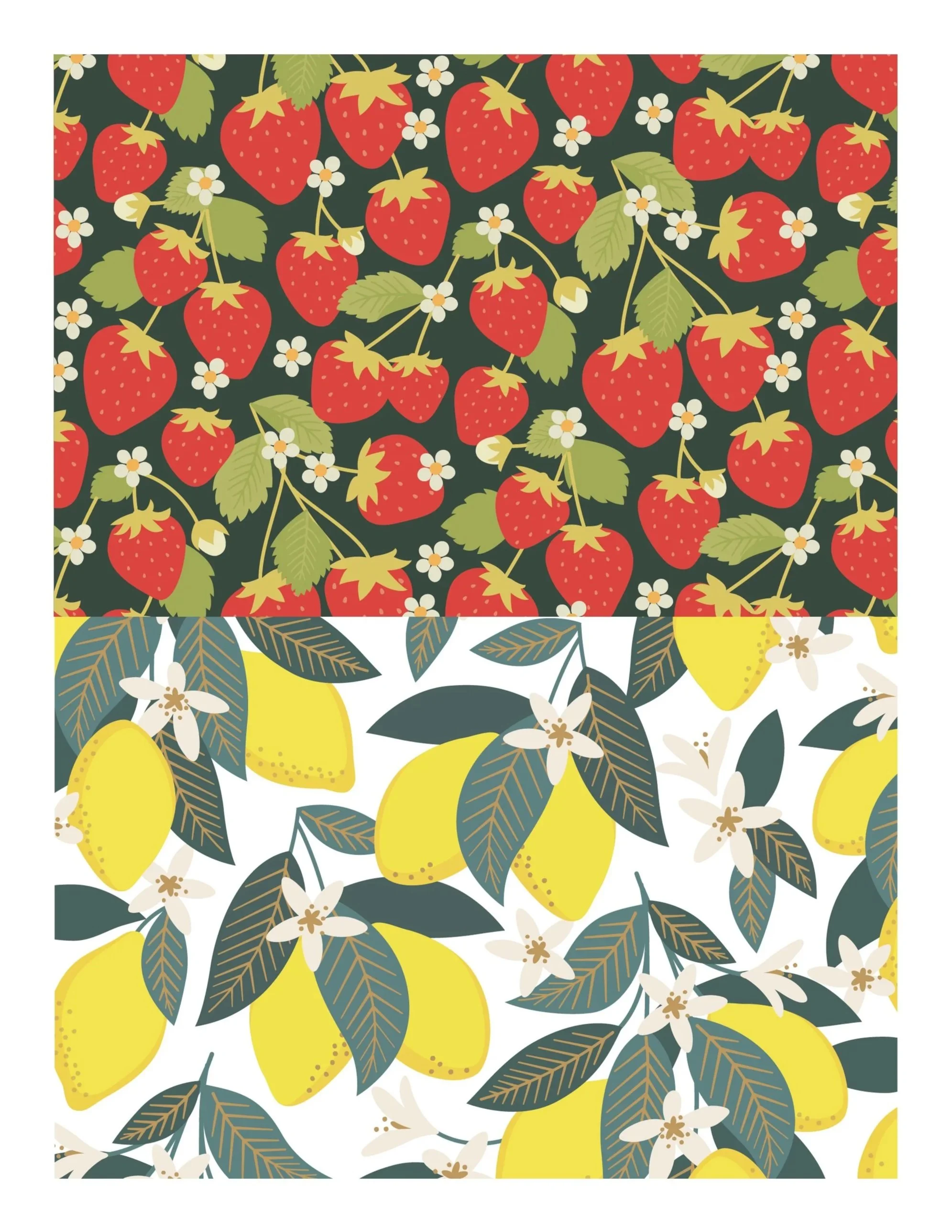 A fresh, nature-inspired pattern series featuring hand-illustrated strawberries and lemons. The collection blends organic shapes and a balanced palette to capture the warmth and vibrance of summer, designed for use across home goods, packaging, and textiles.
